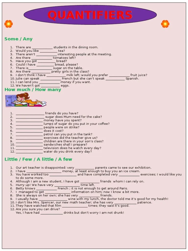 All you need are a few sources and some basic information. With plural count nouns, just add of the between the quantifier and the noun it . Quantifiers list and examples · there are a few oranges. One, each and every are examples of countable noun quantifiers. Countable and uncountable nouns share many of the same quantifiers,.